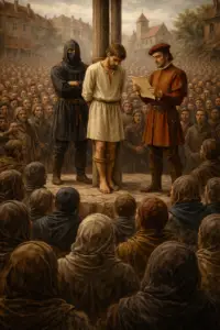 Jednalo se o období středověku. Muž je násilně přivlečen na pódium a přivázán ke kůlu. Ruce má svázané za zády, kolem stojí kati, před ním je dav. Šlechtic čte listinu, ve které je muž označen za zrádce. Přestože ví, že obvinění je nepravdivé, nikdo se ho nezastane. Cítí bezmoc a bezpráví. Dav na něj kouká, ale nikdo mu nepomůže.